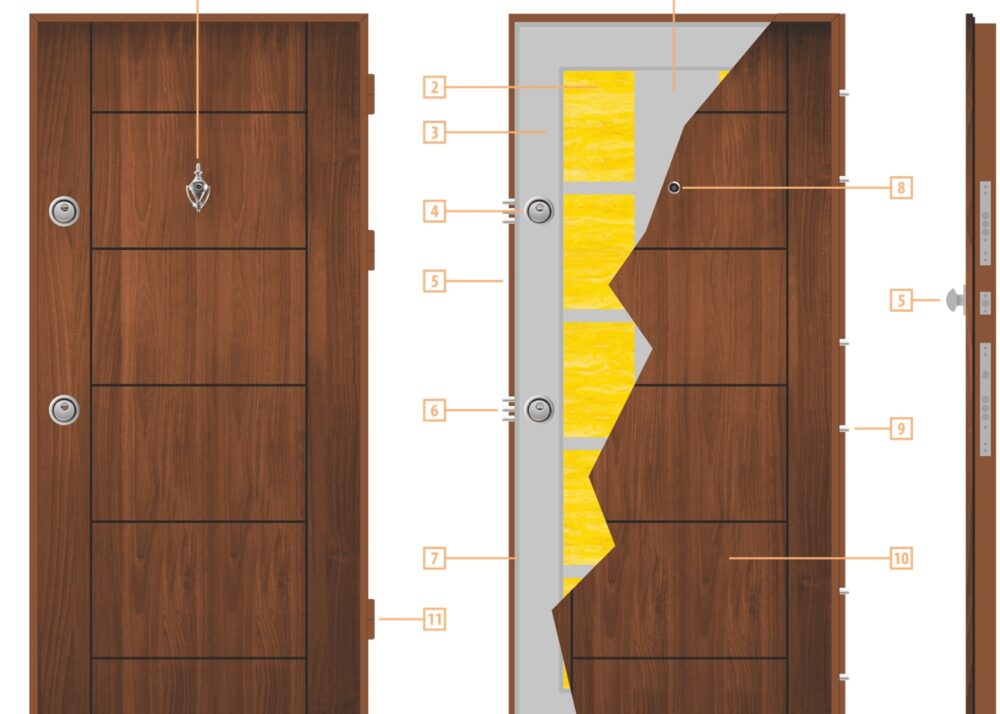 Структурата на крилата на вратите от серия Панел – крилата се изработва от два 10мм MDF фрезовани панели с ламинирано покритие, между които е поставен метален лист с дебелина 1.2мм, за шумо- и топлоизолация пълнежът на крилото е минерална вата и метално оребряване.