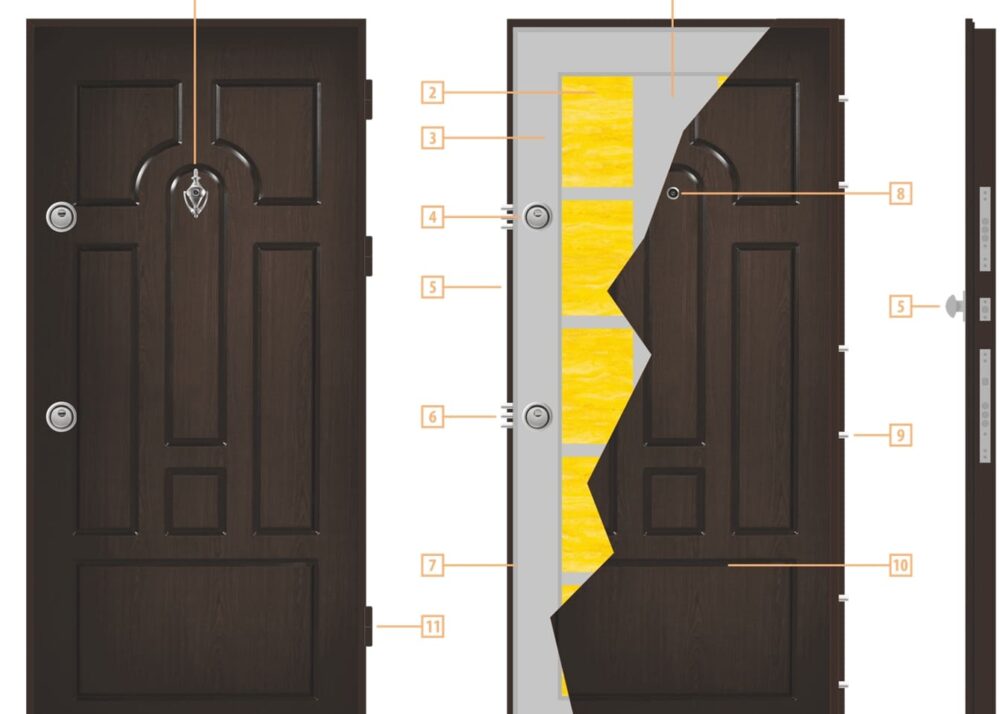 Структурата на крилото на модел блиндирана врата Т-108 от серия Панел – крилото се изработва от два фрезовани 10мм MDF панели с боядисано и лакирано покритие, между които е поставен метален лист с дебелина 1.2мм, за шумо- и топлоизолация пълнежът на крилото е минерална вата и метално оребряване.