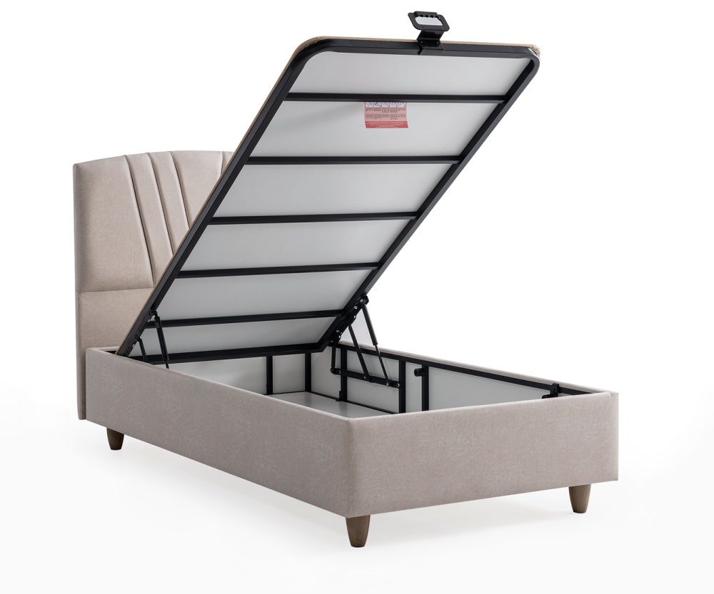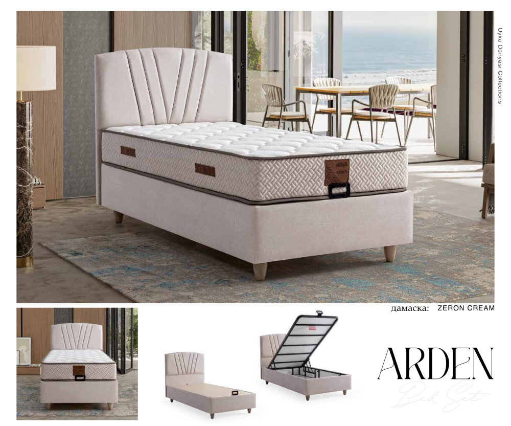 Единичното тапицирано легло Arden включва модерна капитонирана табла и тапицирана основа с вградена повдигаща се подматрачна система с газови амортисьори. Леглото е тапицирано с качествена дамаска ZERON CREAM в елегантен бежов крем цвят, който придава модерен и естетичен вид. Конструкцията осигурява просторно и удобно място за съхранение на спално бельо, възглавници, одеяла и други вещи, съчетавайки функционалност, комфорт и практичност в едно стилно решение за всяка модерна спалня, детска стая или гостна.