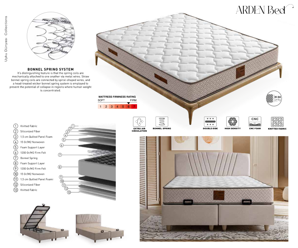 - Матрак Arden е с ядро от Bonel Spring пружинна система обвита с борд от дунапрен с висока плътност и допълнителни омекотяващи слоеве от дунапрен и HR пяна.