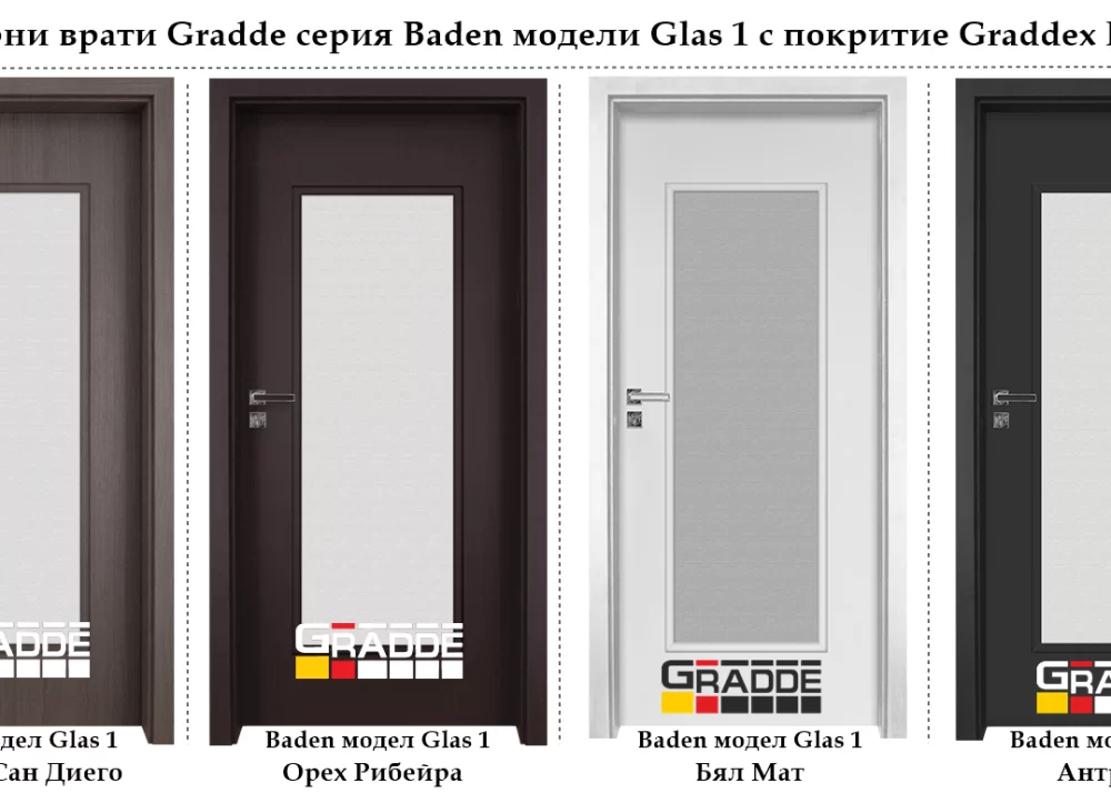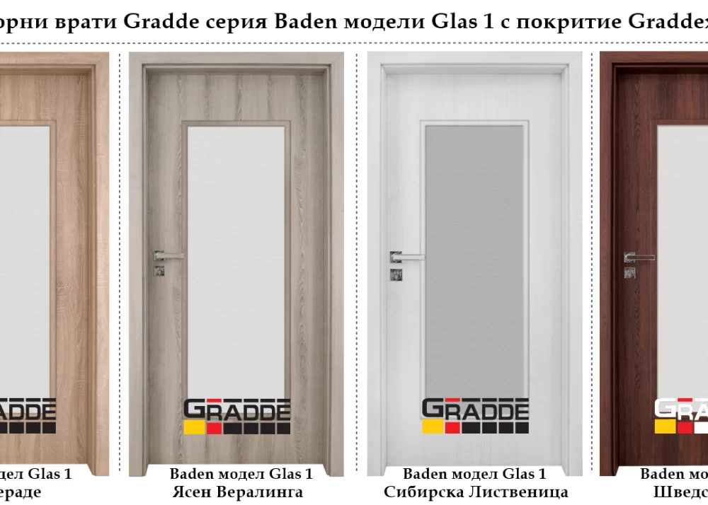 Всички модели интериорни врати Gradde от серия Baden, се предлагат с два вида покритие в 8 цвята.