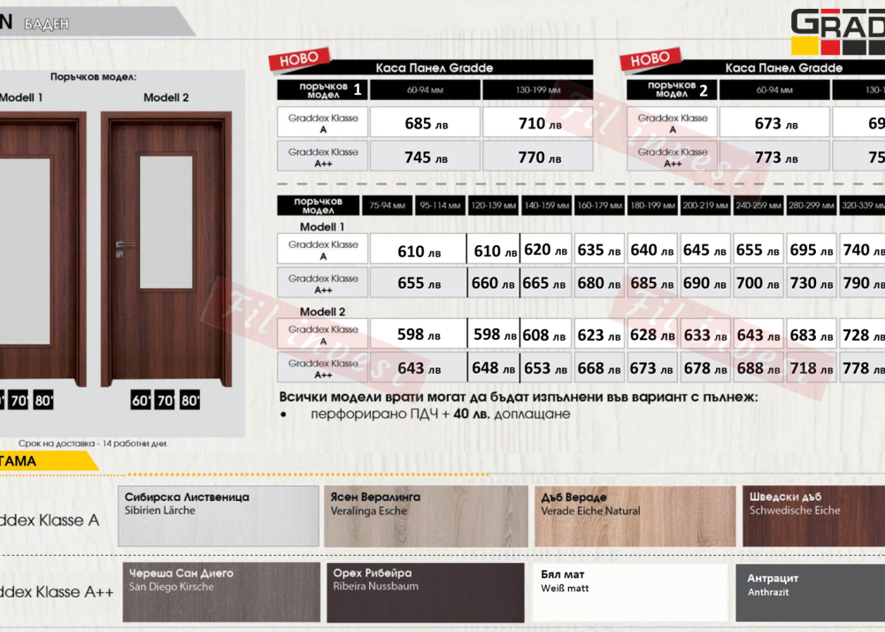 Подробни цени за всички модели интериорни врати Gradde от серия Baden, с двата вида каси и двете цветови гами .