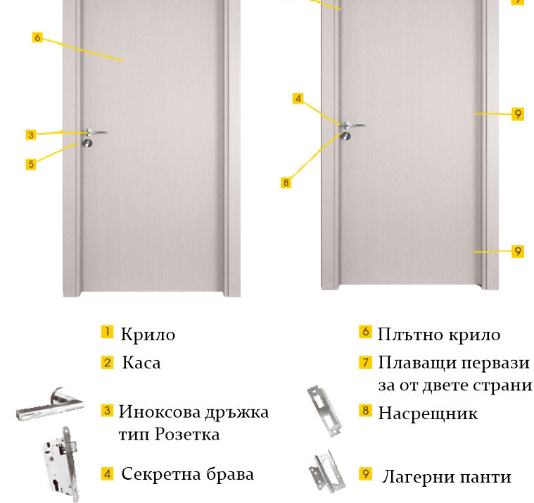 - Интериорна врата Gama с плътно крило и каса Стандарт : Пълната окомплектовка на вратата включва: плътно крило, регулируема каса Стандарт с обхват на зида от 7 до 13см, плаващи первази за двете страни, гумено уплътнение, метална секретна брава, насрещник, патрон с три ключа, три броя лагерни панти, иноксова дръжка тип розетка.