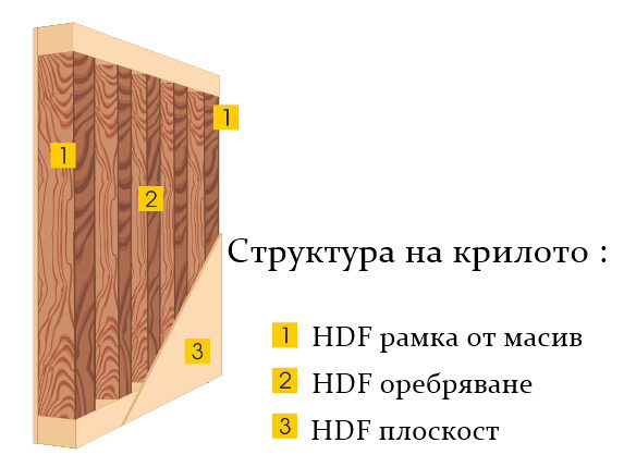 - Крилото се изработва от два броя по 6мм плоскости HDF, с рамка от масив, подсилена в средата с HDF оребряване.