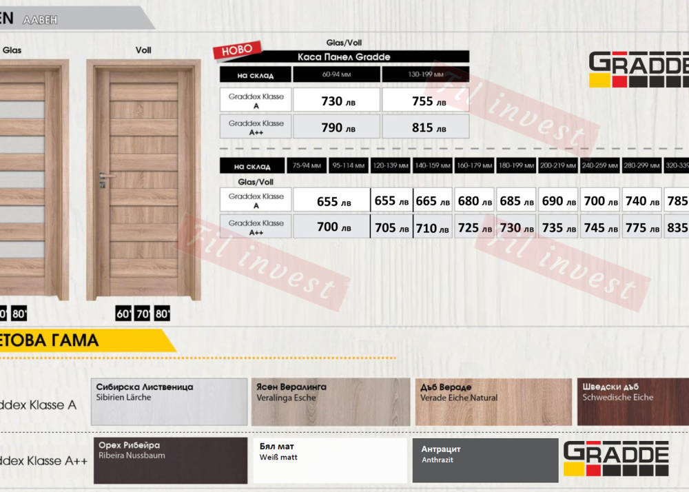 - Интериорни врати Gradde от серия Aaven се предлагат и с остъклени крила модел Aaven Glas, с размери на крилата 70/197.5см, 80/197.5см, са налични на склад, доставят се от 1 до 10 работни дни (безплатна доставка за цялата страна).