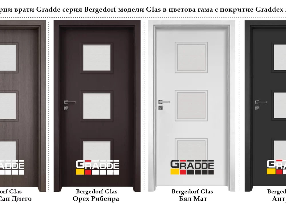 Всички модели интериорни врати Gradde от серия Bergedorf, се предлагат с два вида покритие в 8 цвята.
