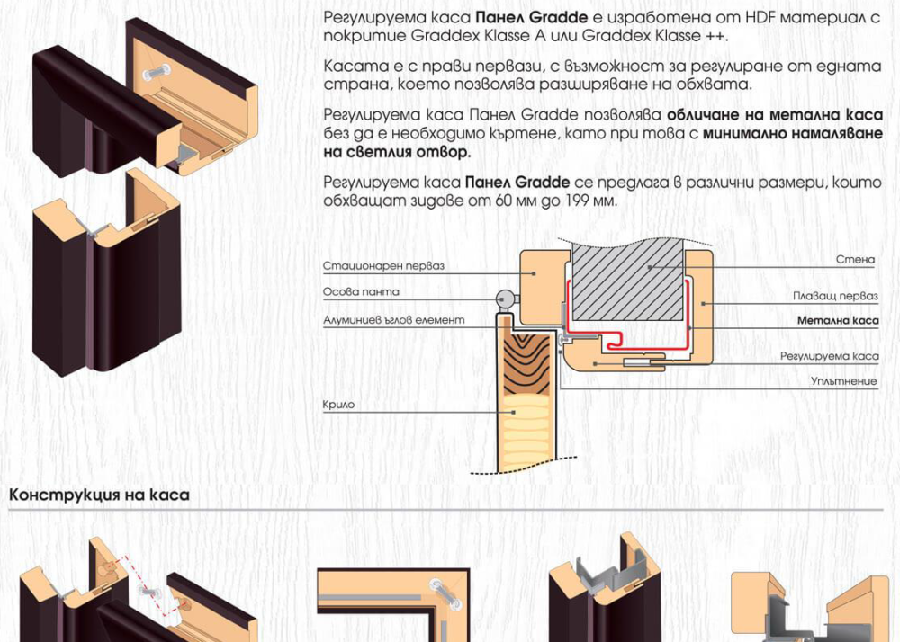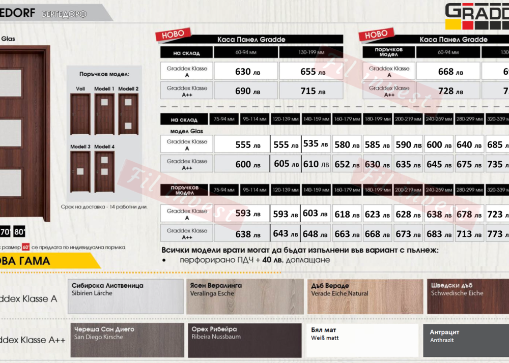 - Вратата се изработва в различни цветове и два вида покрития – Graddex Klasse A и A++, с възможност за избор на по-голяма каса или модел Панел при нужда от по-широк обхват на зида.