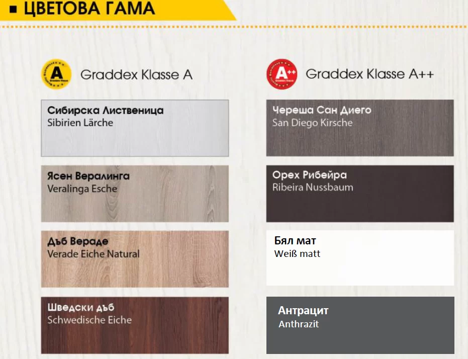 Забележка! В цените НЕ СА ВКЛЮЧЕНИ дръжки ! Поради огромния избор от различни модели дръжки Gradde, всеки клиент има възможността да избере предпочитания модел дръжки и брави.