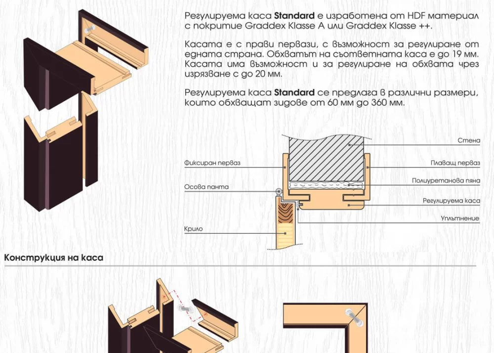 Всички модели интериорни врати Gradde от серия Bergedorf се предлагат с два вида регулируеми каси, подходящи за различна дебелина на зида.