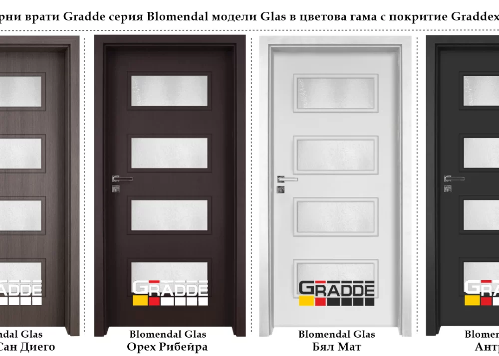 Всички модели интериорни врати Gradde от серия BLOMENDAL, се предлагат с два вида покритие в 8 цвята.