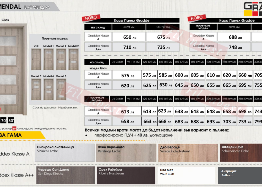 - Вратата се изработва в различни цветове и два вида покрития – Graddex Klasse A и A++, с възможност за избор на по-голяма каса или модел Панел при нужда от по-широк обхват на зида.