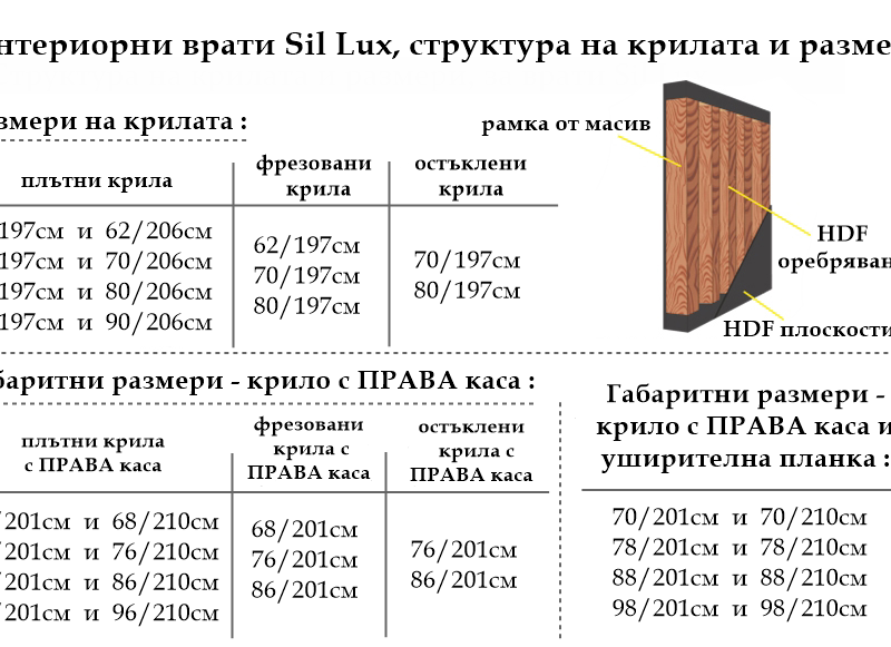 - Модел Sil Lux 3100 с размери на крилото – 62/206, 70/206, 80/206, 90/197 и 90/206см (оскъпяват се).