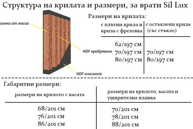 - Модел Sil Lux 3100 с размери на крилото – 62/206, 70/206, 80/206, 90/197 и 90/206см (оскъпяват се).