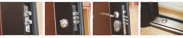 Крило, каса с первази за от едната страна, брава, патрон с пет ключа (плюс два броя-монтажни), иноксова дръжка, шпионка, гумени уплътнeния на крилото и на касата, четири броя вградени в касата панти и дюбели за монтаж.