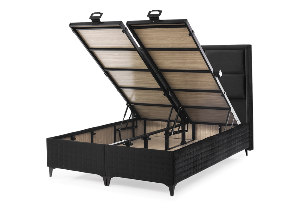 Тапицирано спално легло Versage – основата / базата представлява стабилна и устойчива метална конструкция обвита с ламинирано ПДЧ, тапицирана е с качествена дамаска. Таблата също се изработва от ламиниран ПДЧ материал, капитонирана е с висококачествена дамаска. Основата е снабдена с дъно и нов модел повдигаща система от 1бр / (2бр за двойните размери) метална подматрачна рамка с цял ламиниран ПДЧ панел. Рамката е оборудвана с 2бр / 4бр газови амортисьори /2х2/ по 750N, има спирачка на механизма, която може да се ползва когато механизма е отворен. На дъното и рамката са монтирани вентилационни капачки. Основата предоставя голямо празно подматрачно пространство, подходящо за съхранение на спални завивки и други вещи.