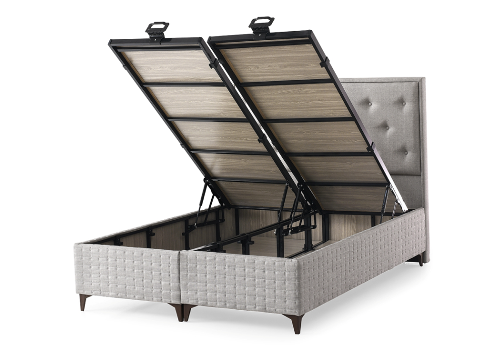 - Базата е снабдена с дъно и нов модел повдигаща система от 1бр (за единичните размери) / 2бр метална подматрачна рамка с цял ламиниран ПДЧ панел. Рамката е оборудвана с 2бр / 4бр газови амортисьори /2х2/ по 750N, може да се повдига всяка основа по отделно или заедно, има спирачка на механизма, която може да се ползва когато механизма е отворен. На дъното и рамката са монтирани вентилационни капачки. Основата предоставя голямо празно подматрачно пространство, подходящо за съхранение на спални завивки и други вещи.