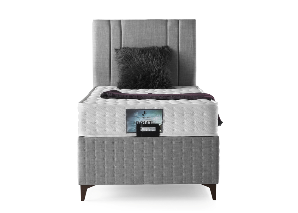 Тапицирано легло Dolce е с красива капитонирана табла и основа, в модерен дизайн. Предлага се в комплект с комфортен матрак Dolce. Може да се закупи и без матрака. Тапицираното легло Dolce може да се поръча и изработи в 18 цвята, също така да се изработи в 8-осем стандартни размера, като единично легло подходящо за детска стая и като голямо двойно спално легло, подходящо за всяко спално помещение. Легло Dolce е модулно, готов вариант в комплект с капитонирана основа, капитонирана табла и матрак. Тапицираното легло Dolce е снабдено с нов модел повдигаща се подматрачна рамка.