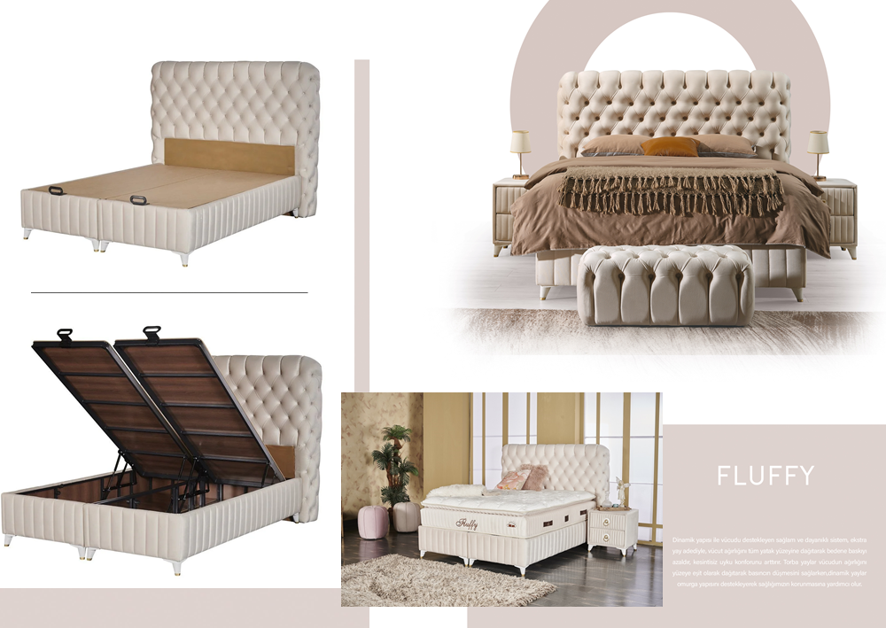 Тапицирано легло Fluffy Крем Праскова е с голяма капитонирана табла и основа, в елегантен дизайн. Предлага се в комплект с луксозен матрак Fluffy, който е снабден с прошит топ матрак и дизайнерска дамаска. Може да се закупи и без матрака. Тапицирано спално легло Fluffy се предлага в 4 цвята – Перлено Светло Сиво, Бяла Перла, Охра и Крем Праскова. Тапицираната спалня Fluffy може да се поръча и изработи в 9-девет стандартни размера, като единично легло подходящо за детска стая и като голямо двойно спално легло, подходящо за всяко спално помещение. Тапицирано легло Fluffy е модулно, готов вариант в комплект с капитонирана основа, капитонирана табла и матрак. Тапицираната спалня Fluffy е снабдено с нов модел повдигаща се подматрачна рамка.