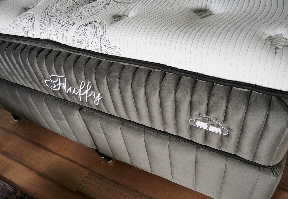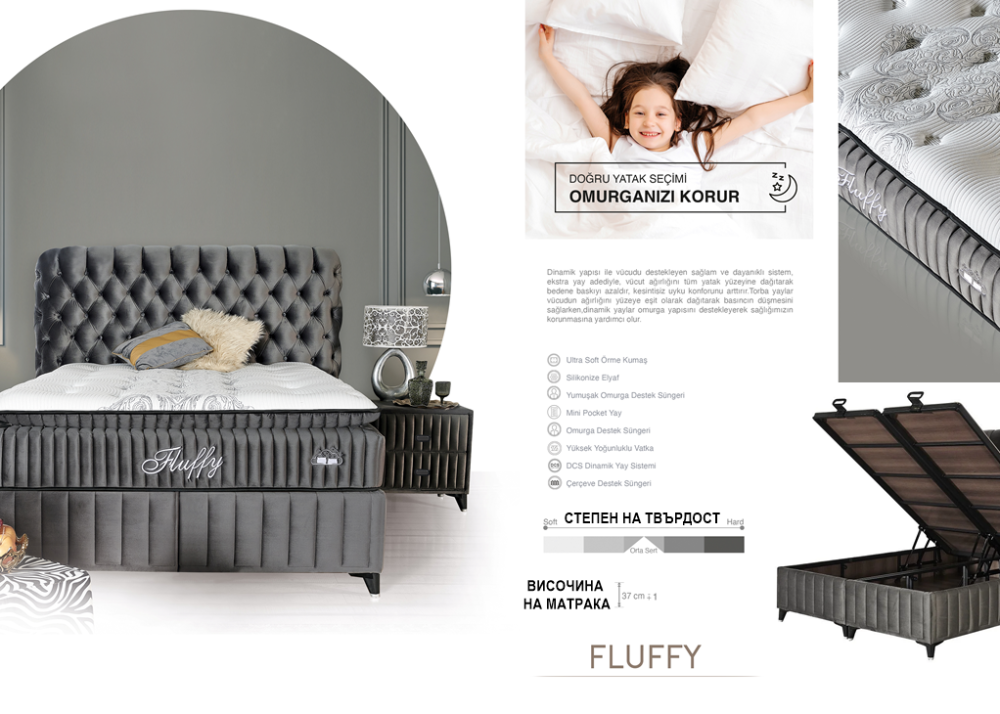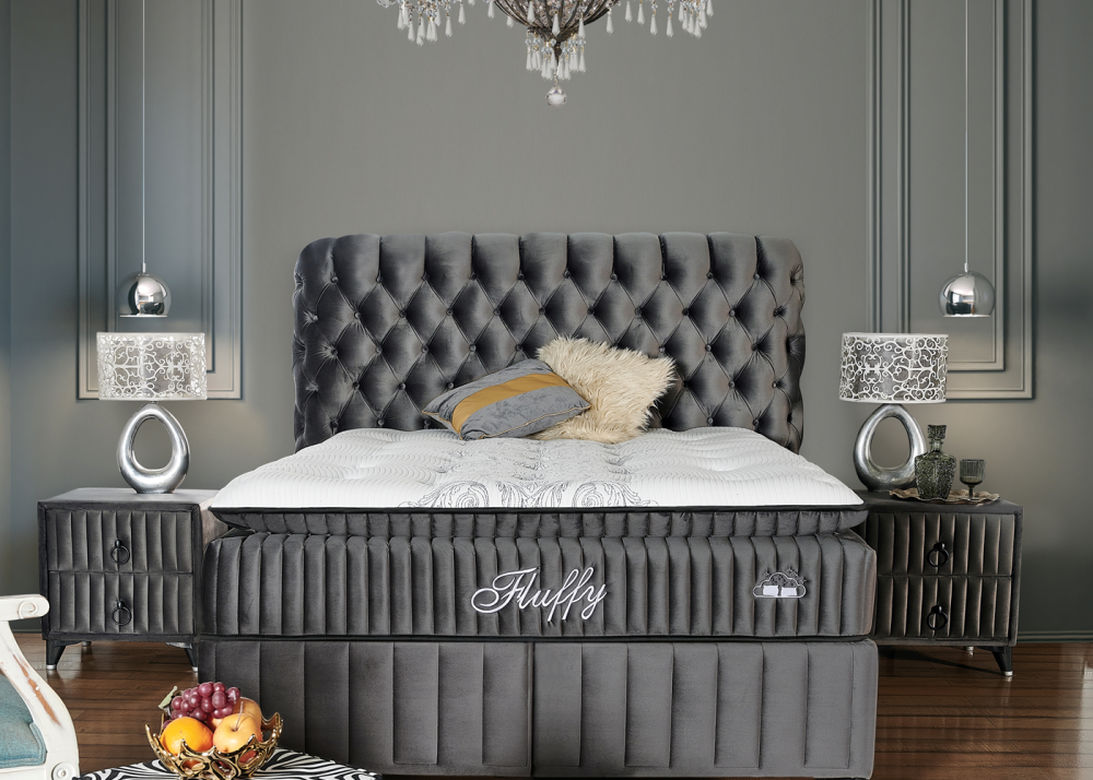 Тапицирано легло Fluffy е с голяма капитонирана табла и основа, в елегантен дизайн. Предлага се в комплект с луксозен матрак Fluffy, който е снабден с прошит топ матрак и дизайнерска дамаска. Може да се закупи и без матрака. Тапицирано спално легло Fluffy се предлага в 4 цвята – Перлено Светло Сиво, Бяла Перла, Охра и Крем Праскова. Тапицираната спалня Fluffy може да се поръча и изработи в 9-девет стандартни размера, като единично легло подходящо за детска стая и като голямо двойно спално легло, подходящо за всяко спално помещение. Тапицирано легло Fluffy е модулно, готов вариант в комплект с капитонирана основа, капитонирана табла и матрак. Тапицираната спалня Fluffy е снабдено с нов модел повдигаща се подматрачна рамка.