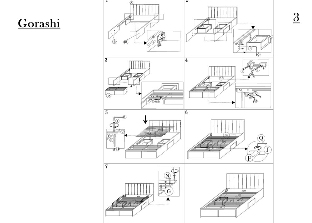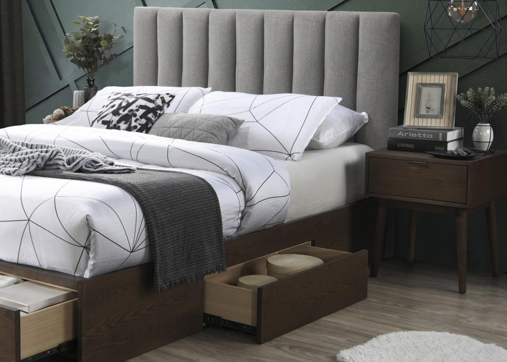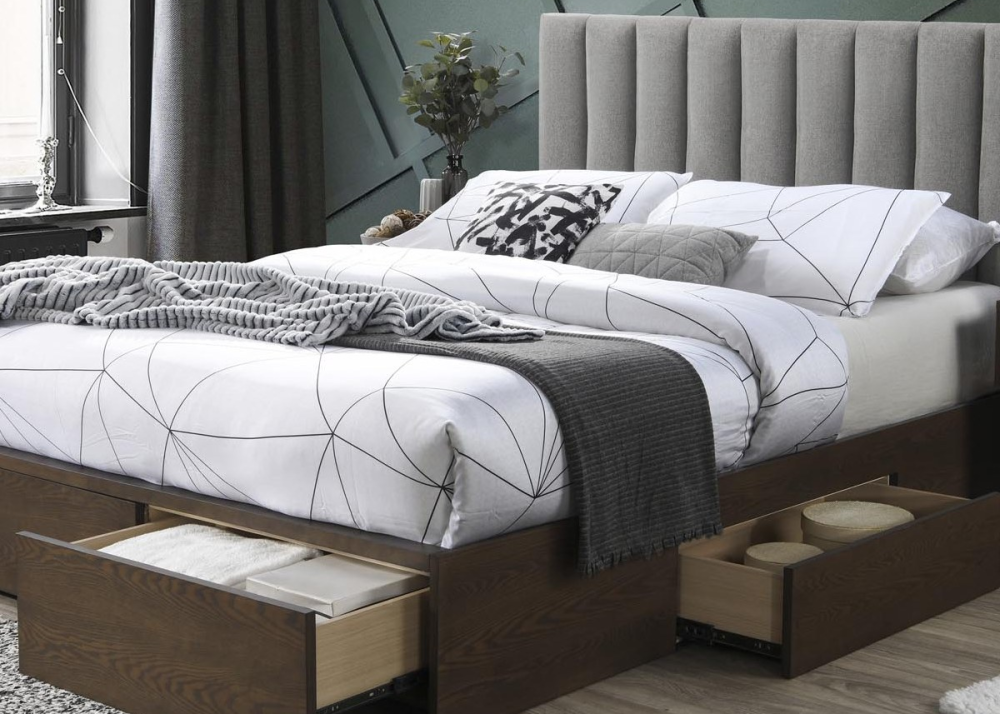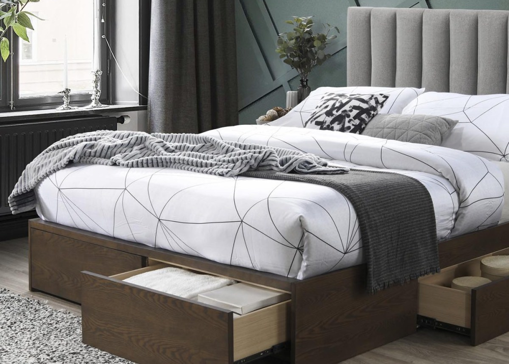 Тапицирано легло Gorashi е функционално спално легло с 4бр чекмеджета. Конструкцията е здрава и устойчива, изработва се от MDF + естествен фурнир / масивно каучуково дърво. Състои се от стабилна основа, капитонирана табла и 4 чекмеджета. Тапицирано легло Grace е снабдено с плъзгащи механизми на чекмеджетата и дървена подматрачна рамка.