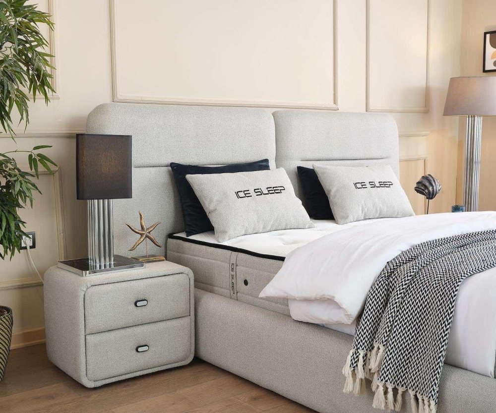 Тапицираното легло Ice Sleep е модулен модел, съчетаващ стилен дизайн, практичност и комфорт. Включва капитонирана табла и основа с вградена подматрачна рамка, снабдена с газови амортисьори и просторно място за съхранение на спално бельо, завивки и други вещи.