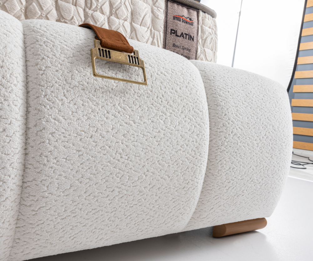Тапицираното легло Platin Uyku Dünyası е впечатляващ дизайнерски модел, съчетаващ луксозна визия, функционалност и висококачествена изработка, създадено с внимание към всеки детайл. Таблата и основата са тапицирани с устойчива и мека дамаска TROYA 01, която внася усещане за уют, естетика и комфорт във всяка модерна спалня. Основата на леглото е оборудвана с вградена повдигаща се подматрачна система с газови амортисьори, допълнена от елегантни кожени дръжки, които улесняват отварянето. Вътрешното пространство за съхранение е просторно и практично, подходящо за завивки, възглавници, спално бельо и други вещи, които изискват дискретно и организирано подреждане.