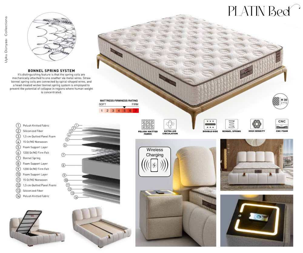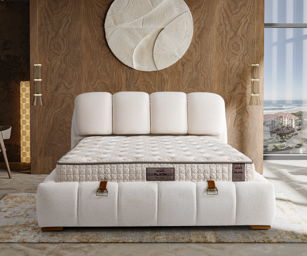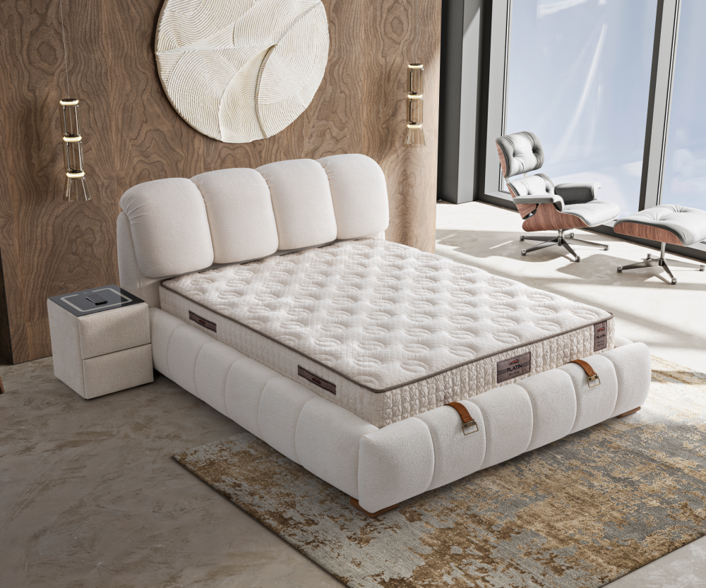 - Матракът Platin разполага с ядро от Bonnell Spring пружинна система, обвито с борд от дунапрен с висока плътност и допълнителни омекотяващи слоеве от дунапрен, мека пяна и HR пяна, които осигуряват стабилност, ортопедична опора и дълготраен комфорт по време на сън. Завършен е с луксозна дишаща дамаска Pelush Knitted Fabrik, която съчетава стил, проветривост и естетична визия, подходяща за всяка модерна спалня.