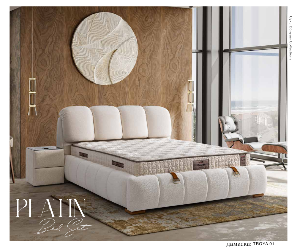 Тапицираното легло Platin от колекцията на Uyku Dünyası се отличава с луксозен дизайн и високо ниво на комфорт, изработено с внимание към всеки детайл. Леглото е тапицирано с висококачествена дамаска TROYA 01, която придава усещане за уют, естетика и изтънчен стил, превръщайки модела в перфектен акцент за всяка съвременна спалня.
