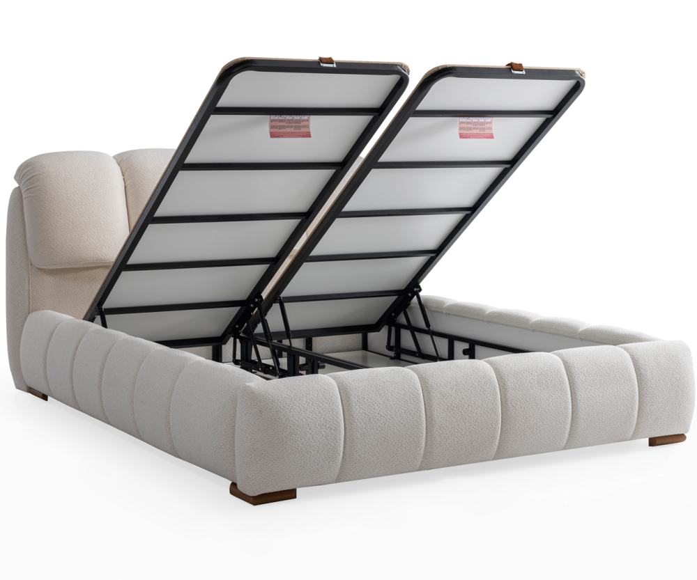 Моделът включва елегантна капитонирана табла и тапицирана основа, снабдена с вградена повдигаща се подматрачна система с газови амортисьори. Основата е оборудвана с елегантни кожени дръжки, които улесняват отварянето и достъпа до просторното вътрешно пространство за съхранение на завивки, възглавници, спално бельо и други вещи.