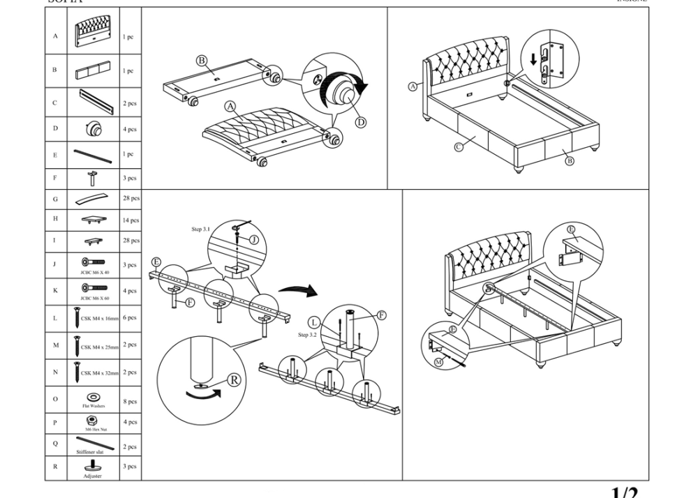 Тапицирано легло Sofia се изработва от качествени и устойчиви материали. Спалното легло представлява основа от масивна дървесна конструкция и голяма табла за главата и устойчиви. Основата и таблата на тапицирано легло Sofia, са капитонирани с висококачествена изкуствена Еко кожа. Спалнята е снабдена с устойчива ламелна дървена подматрачна рамка и елегантни крачета. Не притежава повдигаща подматрачна рамка.