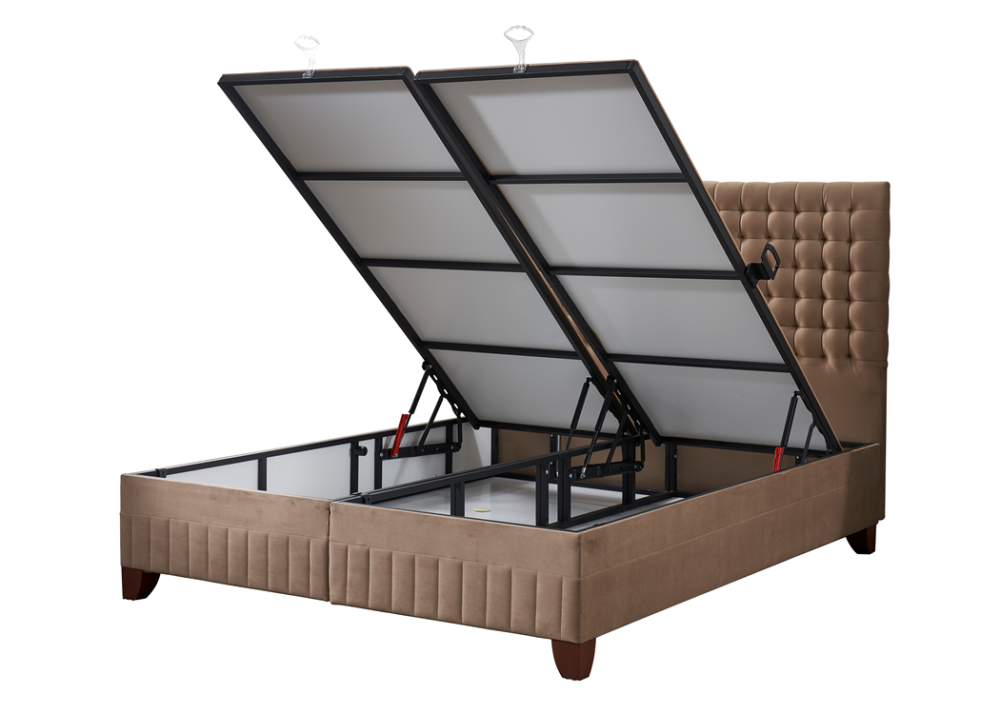 - Базата е снабдена с дъно и нов модел повдигаща система от 1бр (за единичните размери) / 2бр метална подматрачна рамка с цял ламиниран ПДЧ панел. Рамката е оборудвана с 2бр / 4бр газови амортисьори /2х2/ по 750N, може да се повдига всяка основа по отделно или заедно, има спирачка на механизма, която може да се ползва когато механизма е отворен. На дъното и рамката са монтирани вентилационни капачки. Основата предоставя голямо празно подматрачно пространство, подходящо за съхранение на спални завивки и други вещи.