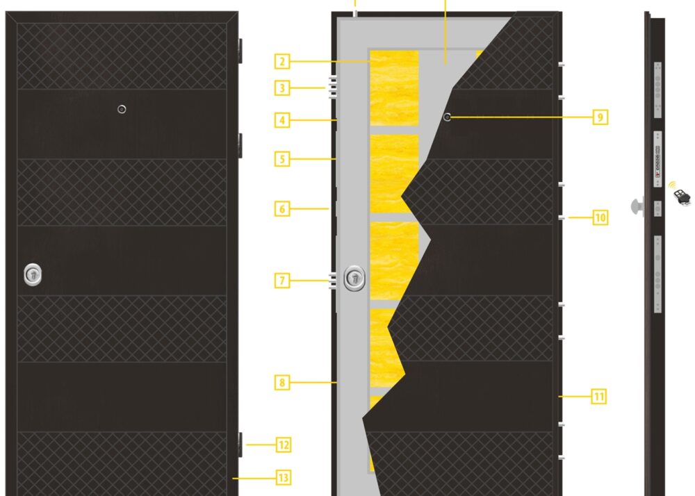 Крило, черна регулируема метална каса с обхват на зида от 150мм до 340мм, гумено уплътнение за крило и каса, три регулируеми панти, пет броя планки за щоков монтаж, осем противовзломни шипа, вградена алармена система с дистанционно управление, метален Г-образен профил на прага, върху който се изгражда основния праг, MDF декоративна каса и прилежащи первази, централна заключваща система, две секретни брави, един секретен патрон, капачка против разбиване и бронировка на патрона, втора допълнителна заключваща система тип „резе“, шпионка, иноксова сатенирана подвижна дръжка за вътрешната страна на вратата, подвижна или пасивна дръжка за външната страна.