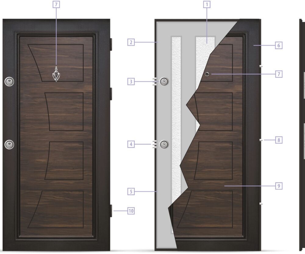 • Комплекта включва: Крило, регулируема каса за зид от 150мм до 340мм, гумено уплътнение за каса, иноксова сатенирана подвижна дръжка за вътрешната страна на вратата, по избор подвижна или пасивна дръжка за външната страна, шпионка с метално чукче, три броя нерегулируеми панти, три противовзломни шипа, метален Г-образен профил на прага, две независими заключващи системи, две секретни брави, два секретни патрона, бронировка на патрона с вдлъбната капачка против разбиване, три секретни и три секретни ямкови ключа.