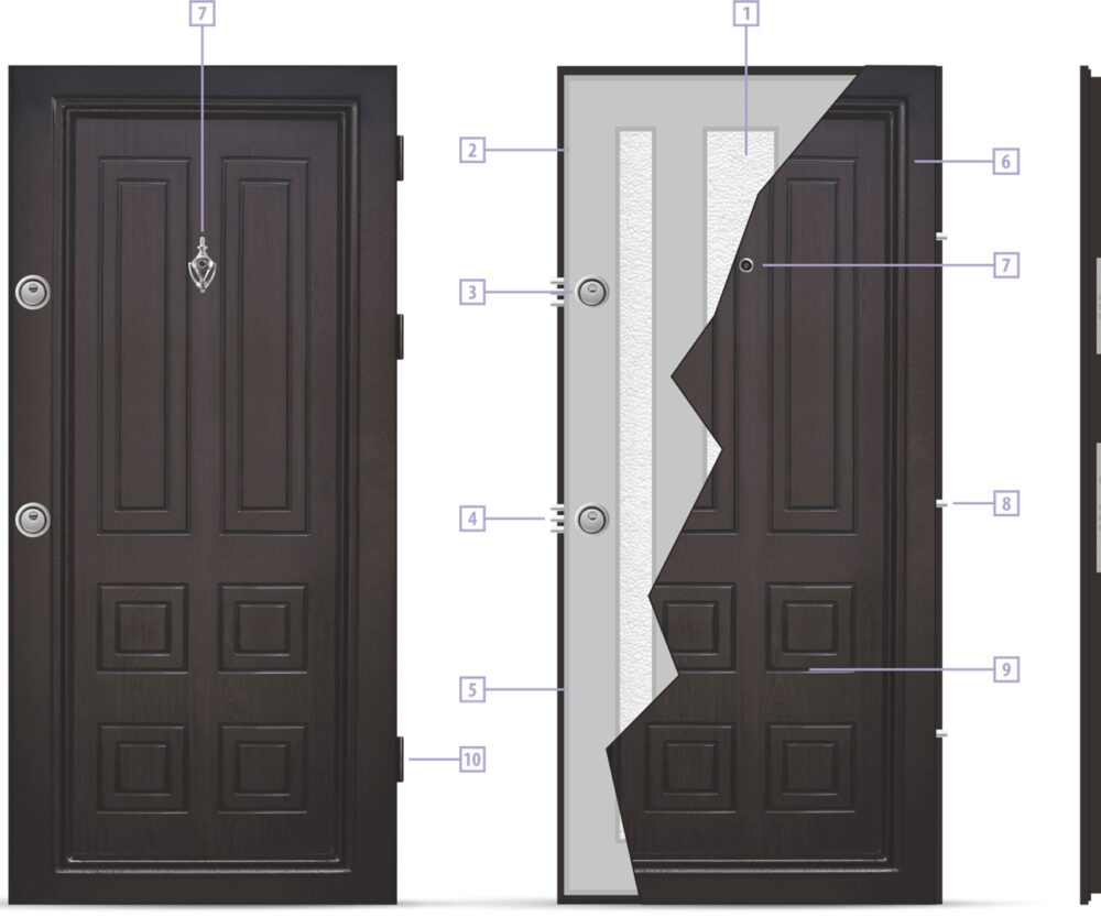 Крило, регулируема каса, гумено уплътнение за каса, иноксова сатенирана подвижна дръжка за вътрешната страна на вратата, по избор подвижна или пасивна дръжка за външната страна, шпионка с метално чукче, три броя нерегулируеми панти, три противовзломни шипа, метален Г-образен профил на прага, две независими заключващи системи, две секретни брави, два секретни патрона, бронировка на патрона с вдлъбната капачка против разбиване, три секретни и три секретни ямкови ключа.