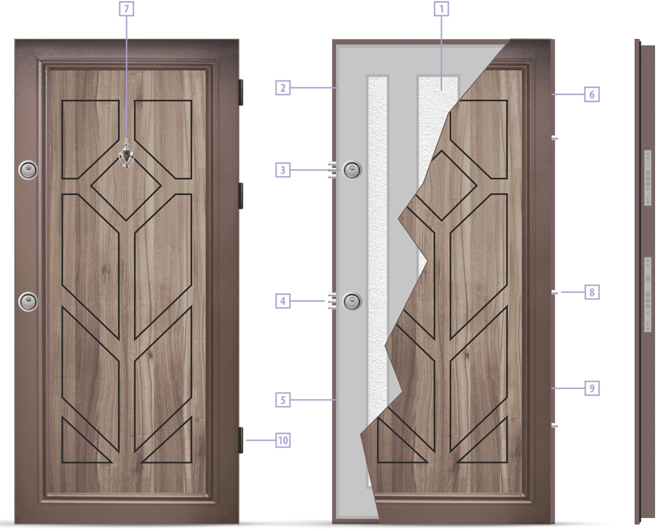 Крило, регулируема каса, гумено уплътнение за каса, иноксова сатенирана подвижна дръжка за вътрешната страна на вратата, по избор подвижна или пасивна дръжка за външната страна, шпионка с метално чукче, три броя нерегулируеми панти, три противовзломни шипа, метален Г-образен профил на прага, две независими заключващи системи, две секретни брави, два секретни патрона, бронировка на патрона с вдлъбната капачка против разбиване, три секретни и три секретни ямкови ключа.