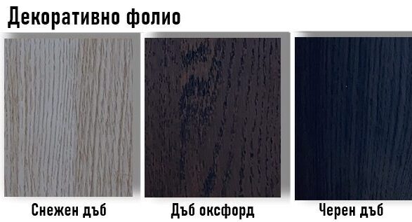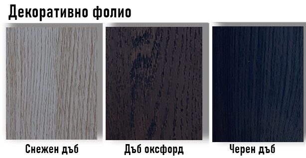 - В покритие Декоративното фолио, в цветове – Снежен дъб, Дъб оксфорд и Черен дъб ;