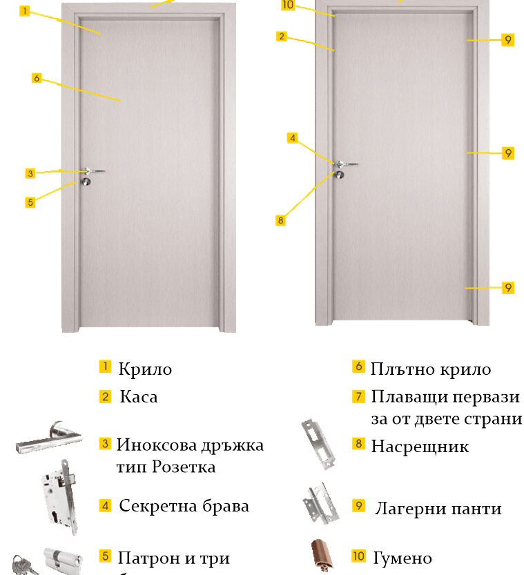 - Интериорна врата Gama с плътно крило и каса Стандарт : Пълната окомплектовка на вратата включва: плътно крило, регулируема каса Стандарт с обхват на зида от 7 до 13см, плаващи первази за двете страни, гумено уплътнение, метална секретна брава, насрещник, патрон с три ключа, три броя лагерни панти, иноксова дръжка тип розетка.