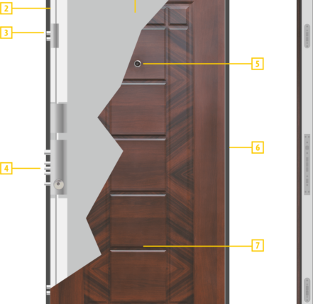 Метална каса от подсилен метал, с дебелина 90мм., необходим отвор за монтаж – 920/1990 мм., с машинно поставено топлопренесено PVC-фолио, фиксирана каса с гумени уплътнения и первази от едната страна..