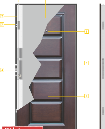 Крило, каса с первази за от едната страна, брава, патрон с пет ключа (плюс два броя-монтажни), иноксова дръжка, шпионка, гумени уплътнeния на крилото и на касата, четири броя вградени в касата панти и дюбели за монтаж.