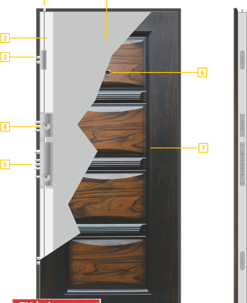 Крило, каса с первази за от едната страна, брава, патрон с пет ключа (плюс два броя-монтажни), иноксова дръжка, шпионка, гумени уплътнeния на крилото и на касата, четири броя вградени в касата панти и дюбели за монтаж.