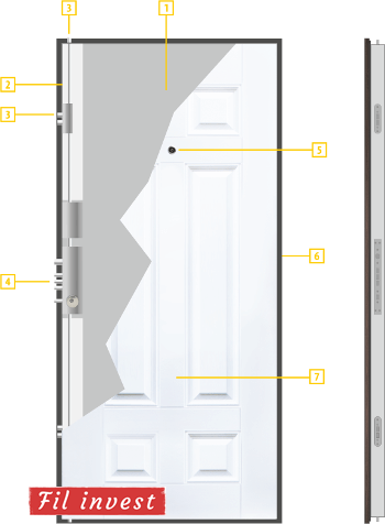 Крило, каса с первази за от едната страна, брава, патрон с пет ключа (плюс два броя-монтажни), иноксова дръжка, шпионка, гумени уплътнeния на крилото и на касата, четири броя вградени в касата панти и дюбели за монтаж.