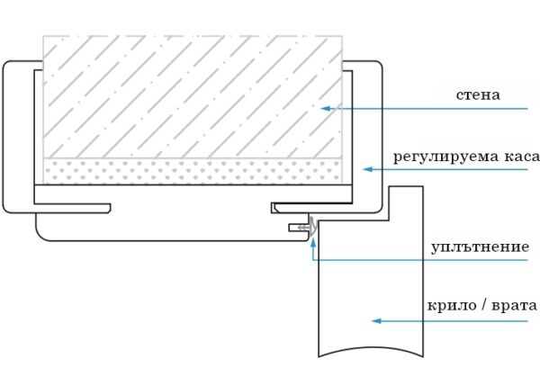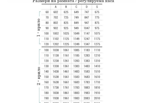 Регулируемата каса за крило с размери – 60′;70′;80′;90′см, две панти за регулируемост от 75-95мм до 280-300мм (с 11 възможности за регулиране), двустранни первази (от едната страна са плаващи и покриват целия отвор), гумени уплътнения, монтажен комплект.