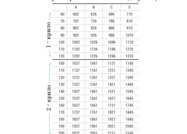 - С допустими леки отклонения за крила – 60′, 70′, 80’см.