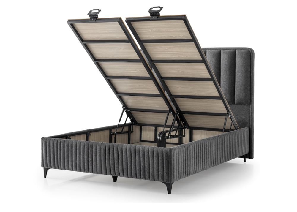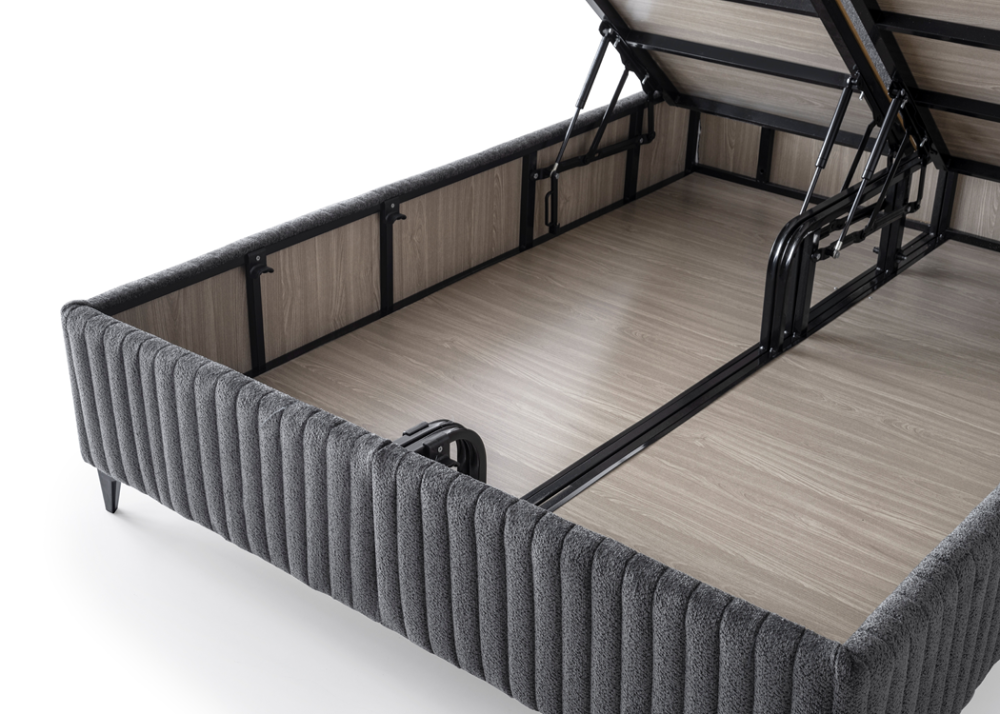 - Базата е снабдена с дъно и нов модел повдигаща система от 1бр (за единичните размери) / 2бр метална подматрачна рамка с цял ламиниран ПДЧ панел. Рамката е оборудвана с 2бр / 4бр газови амортисьори /2х2/ по 750N, може да се повдига всяка основа по отделно или заедно, има спирачка на механизма, която може да се ползва когато механизма е отворен. На дъното и рамката са монтирани вентилационни капачки. Основата предоставя голямо празно подматрачно пространство, подходящо за съхранение на спални завивки и други вещи.