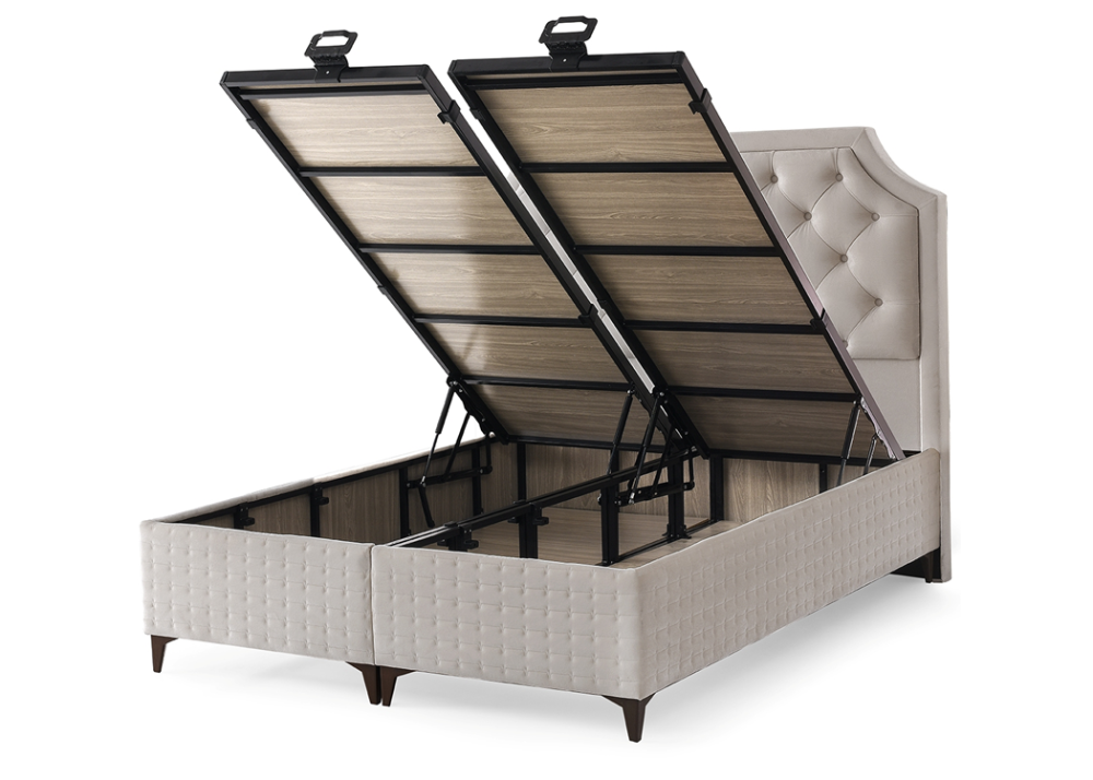 - Базата е снабдена с дъно и нов модел повдигаща система от 1бр (за единичните размери) / 2бр метална подматрачна рамка с цял ламиниран ПДЧ панел. Рамката е оборудвана с 2бр / 4бр газови амортисьори /2х2/ по 750N, може да се повдига всяка основа по отделно или заедно, има спирачка на механизма, която може да се ползва когато механизма е отворен. На дъното и рамката са монтирани вентилационни капачки. Основата предоставя голямо празно подматрачно пространство, подходящо за съхранение на спални завивки и други вещи.