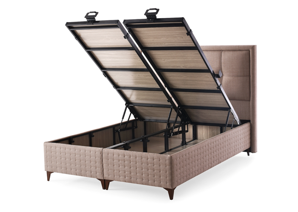 - Базата е снабдена с дъно и нов модел повдигаща система от 1бр (за единичните размери) / 2бр метална подматрачна рамка с цял ламиниран ПДЧ панел. Рамката е оборудвана с 2бр / 4бр газови амортисьори /2х2/ по 750N, може да се повдига всяка основа по отделно или заедно, има спирачка на механизма, която може да се ползва когато механизма е отворен. На дъното и рамката са монтирани вентилационни капачки. Основата предоставя голямо празно подматрачно пространство, подходящо за съхранение на спални завивки и други вещи.