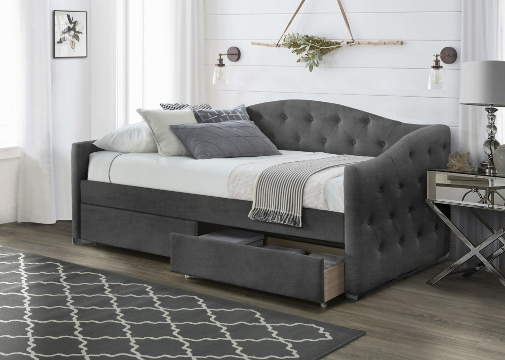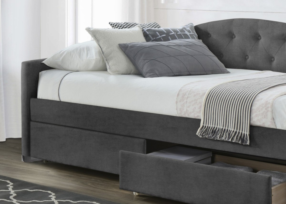 Тапицирано легло Aloha е функционално единично тапицирано легло, с капитонирани табли и две чекмеджета, в модерен дизайн. Тапицирано легло Aloha се предлага комплект с подматрачна рамка, за матрак 90/200см. Легло Aloha се предлага в два цвята, в Сиво и Тъмнозелен цвят.