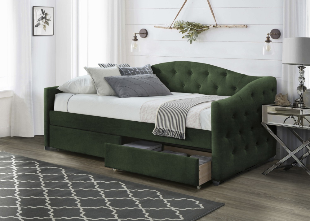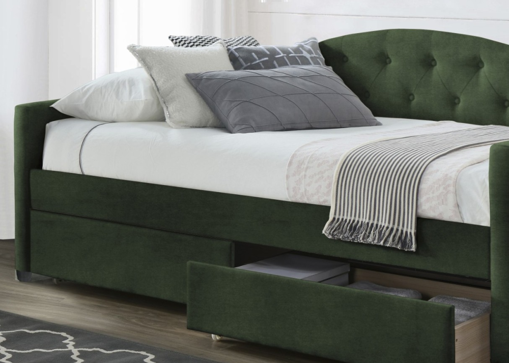 Тапицирано легло Aloha в тъмнозелен цвят. Практично единично легло с две чекмеджета. Предлага се в комплект с подматрачна рамка.