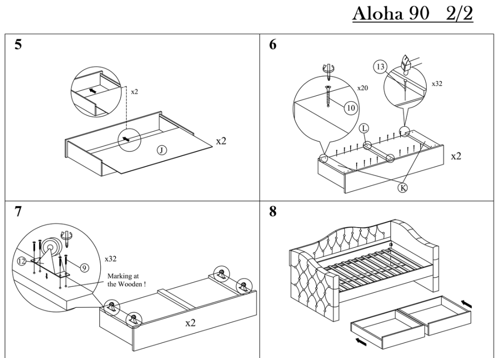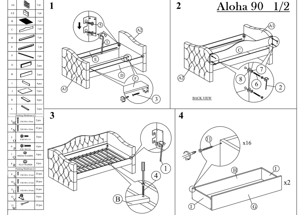 Тапицирано легло Aloha е функционално единично легло с две чекмеджета. Конструкцията е здрава и устойчива, изработва се от масивно каучуково дърво. Състои се от стабилна основа, две странични малки табли, една голяма табла и две чекмеджета. Легло Aloha е снабдено с дървена подматрачна рамка и две чекмеджета с колелца.