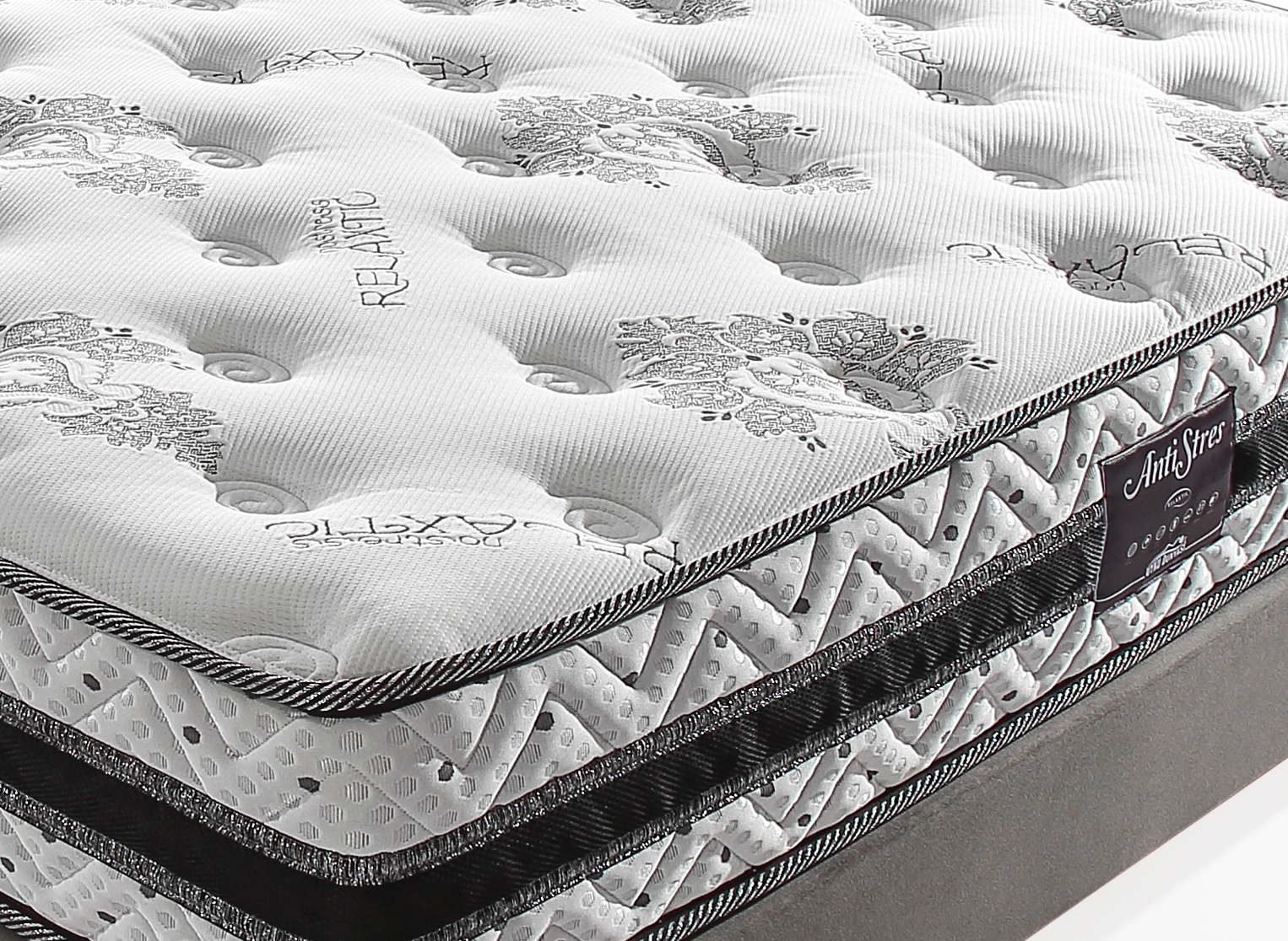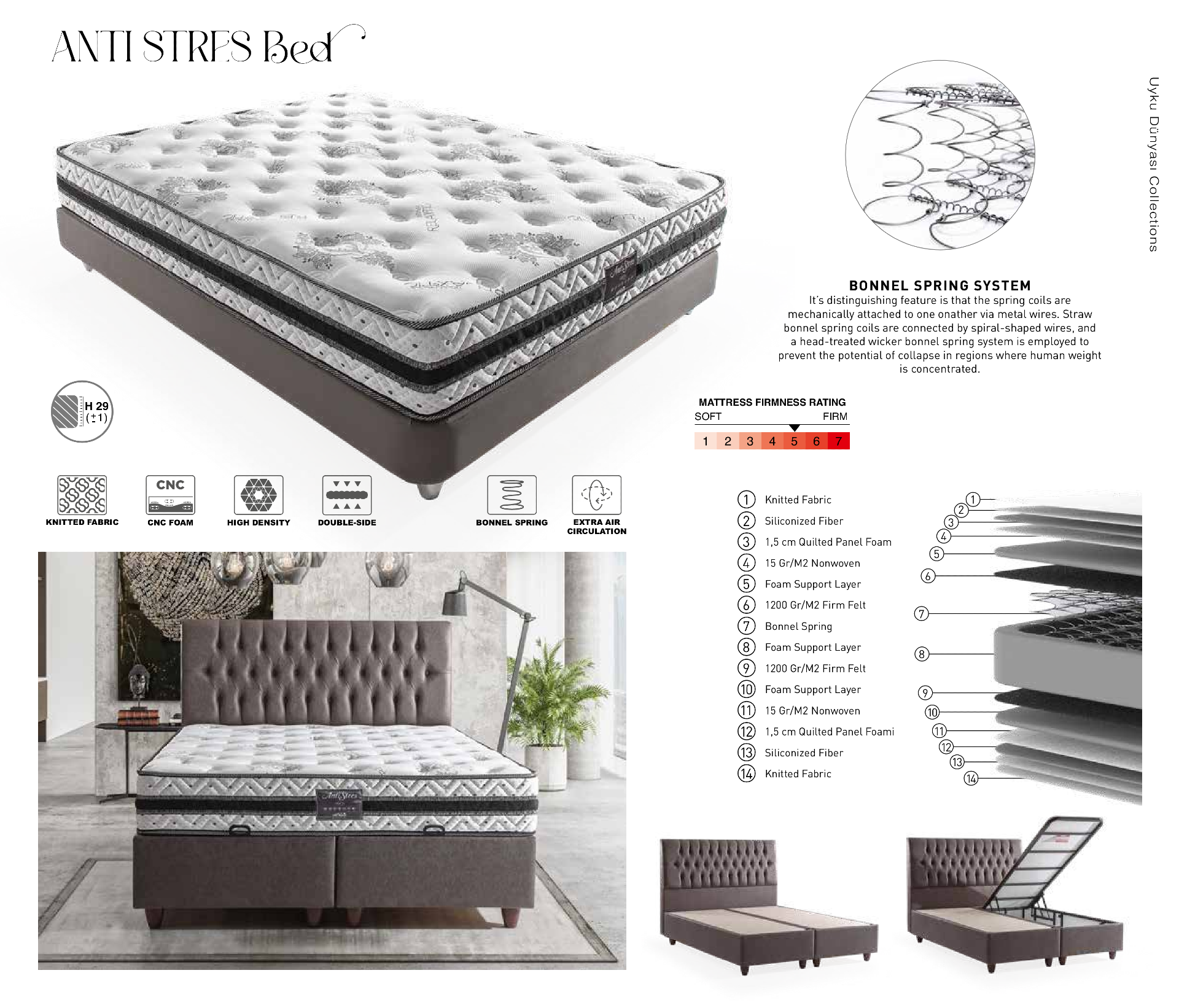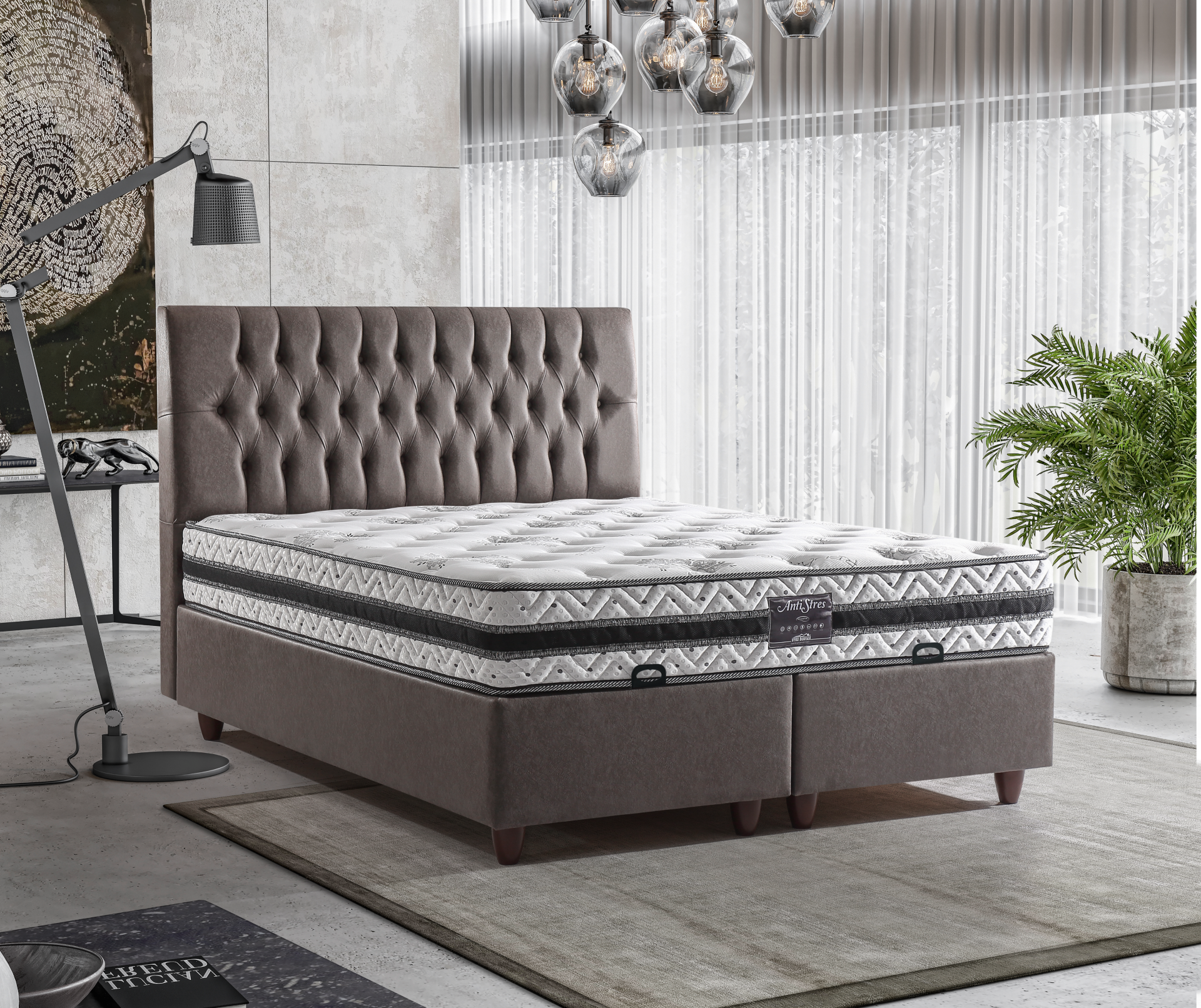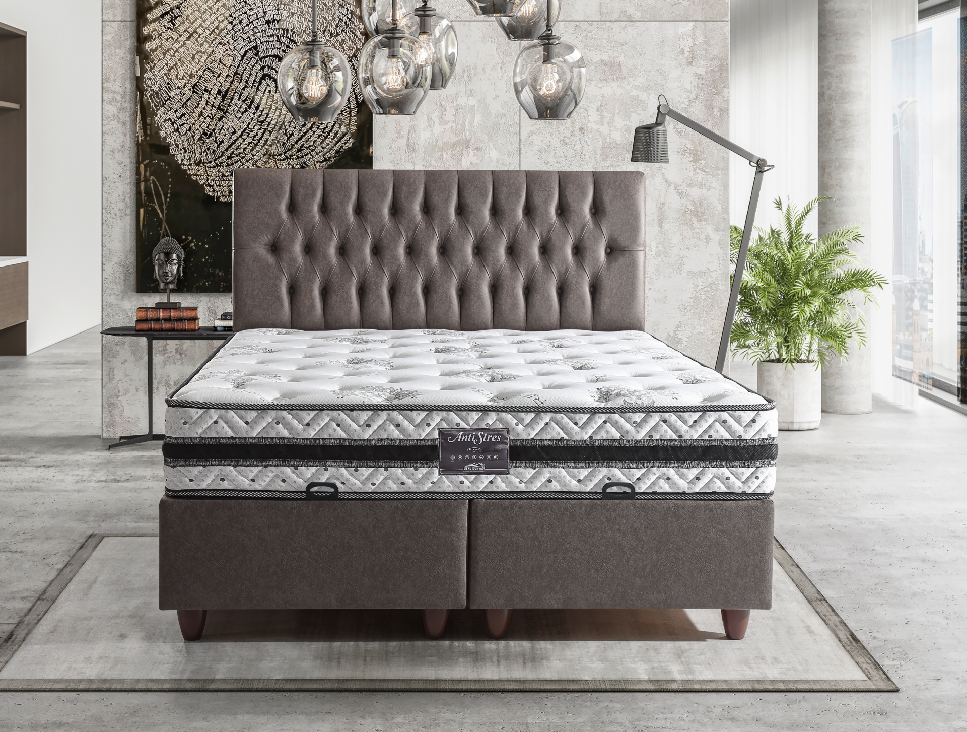 - Матракът Antistres разполага с ядро от Bonnell Spring пружинна система, обвито с борд от дунапрен с висока плътност и допълнителни омекотяващи слоеве от дунапрен и HR пяна, които осигуряват стабилност, ортопедична опора и дълготраен комфорт по време на сън. Завършен е с луксозна дишаща дамаска Knitted Fabrik, която съчетава стил, проветривост и естетична визия, подходяща за всяка модерна спалня.